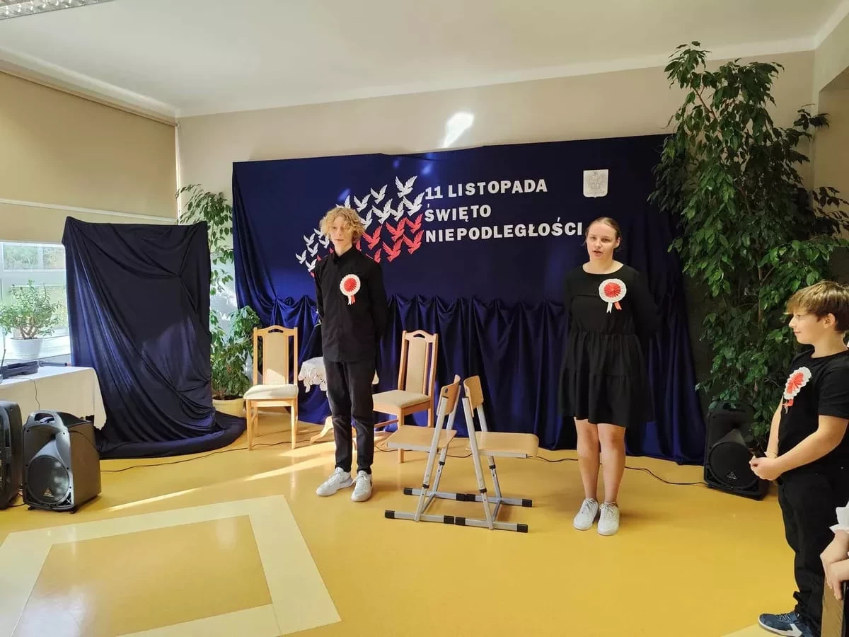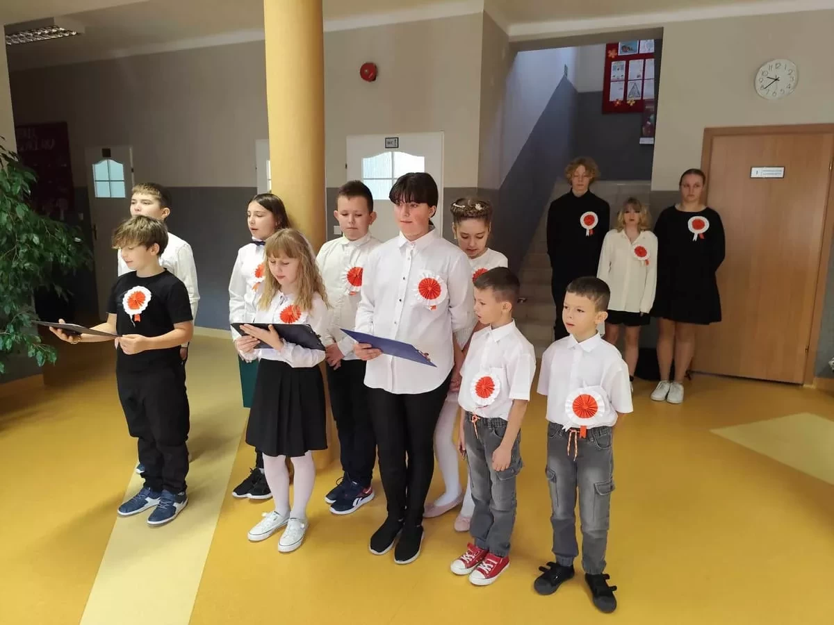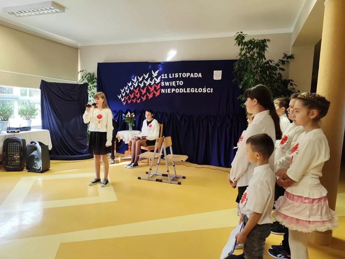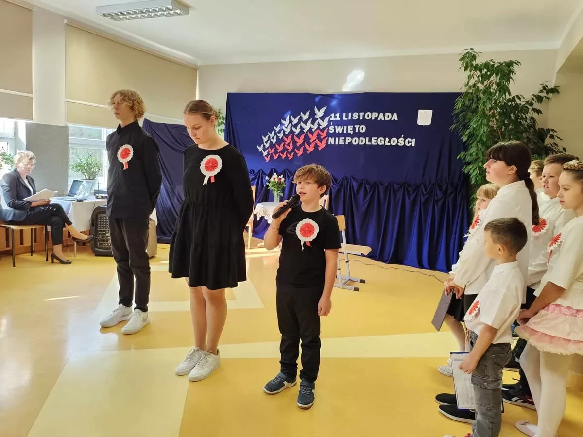 W naszej szkole również pamiętamy o bohaterach i ich zasługach dla naszego kraju. Dlatego, jak co roku, 7 listopada 2024r. odbyła się uroczysta akademia z okazji tej ważnej dla Narodu Polskiego rocznicy. Rozpoczęło ją odśpiewanie Mazurka Dąbrowskiego. W dalszej części uroczystości uczniowie klas IV - VIII przedstawili historię niewoli naszej ojczyzny i drogę do odzyskania upragnionej niepodległości. Przekazywane treści przeplatane były patriotycznymi wierszami i pieśniami, co pozwoliło głębiej przeżyć tamte chwile.