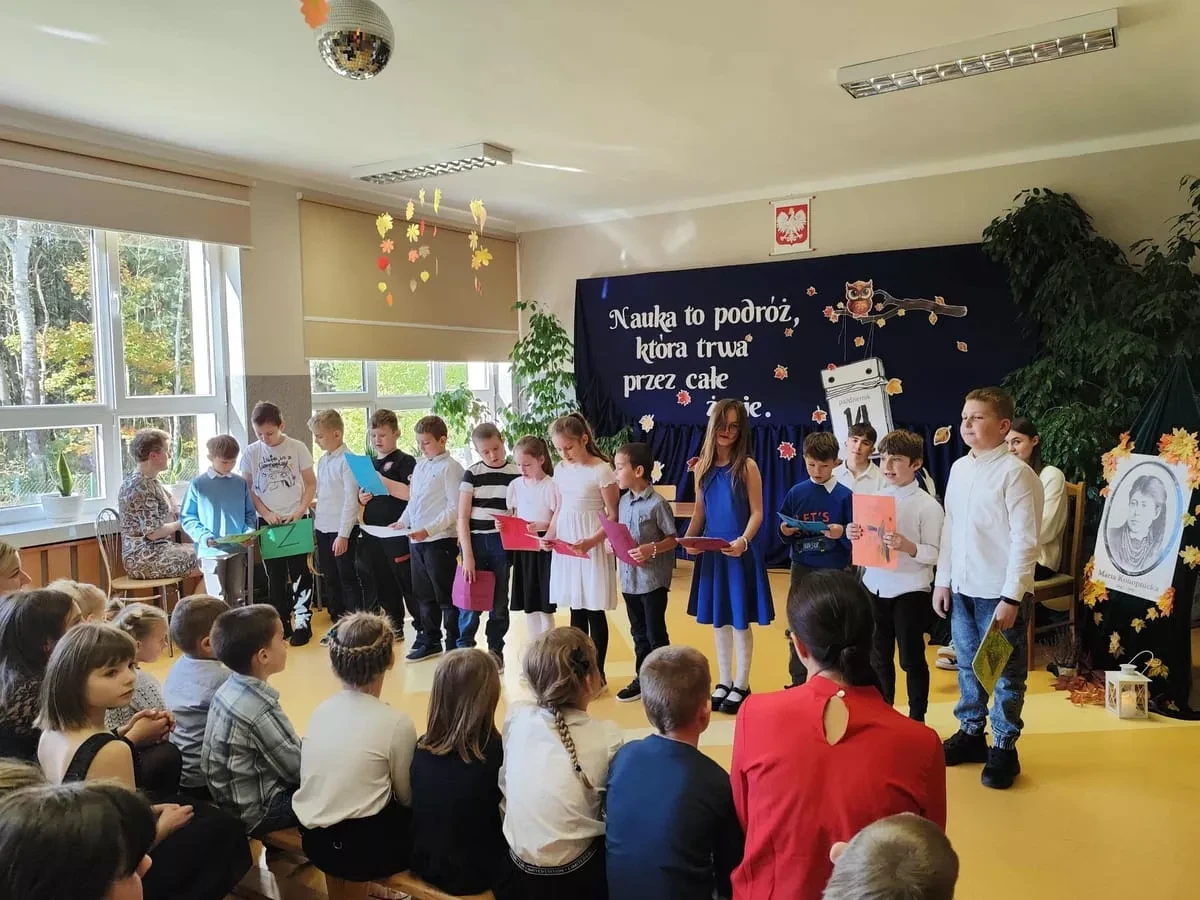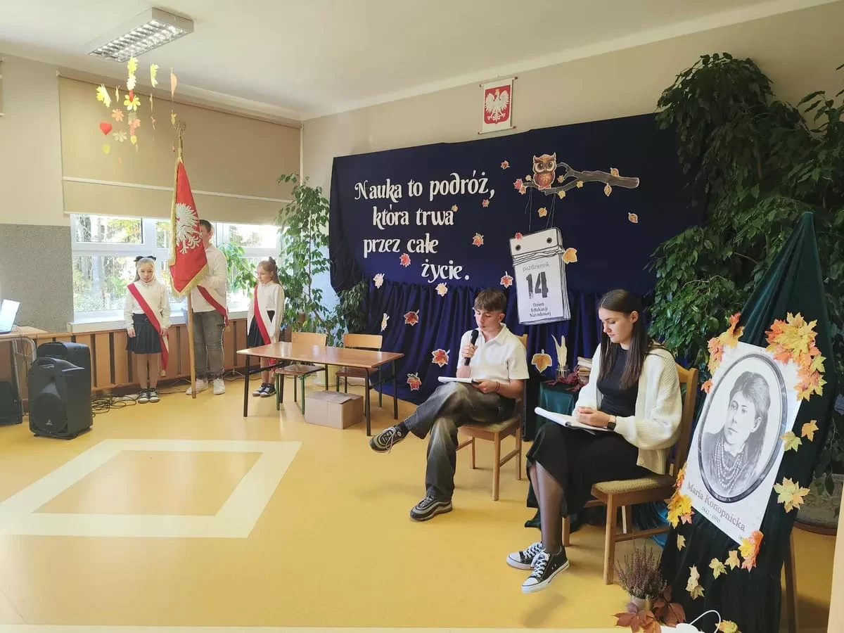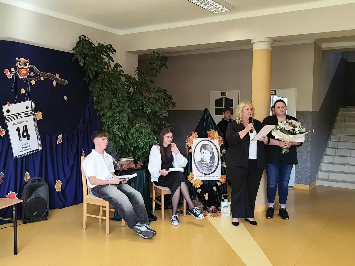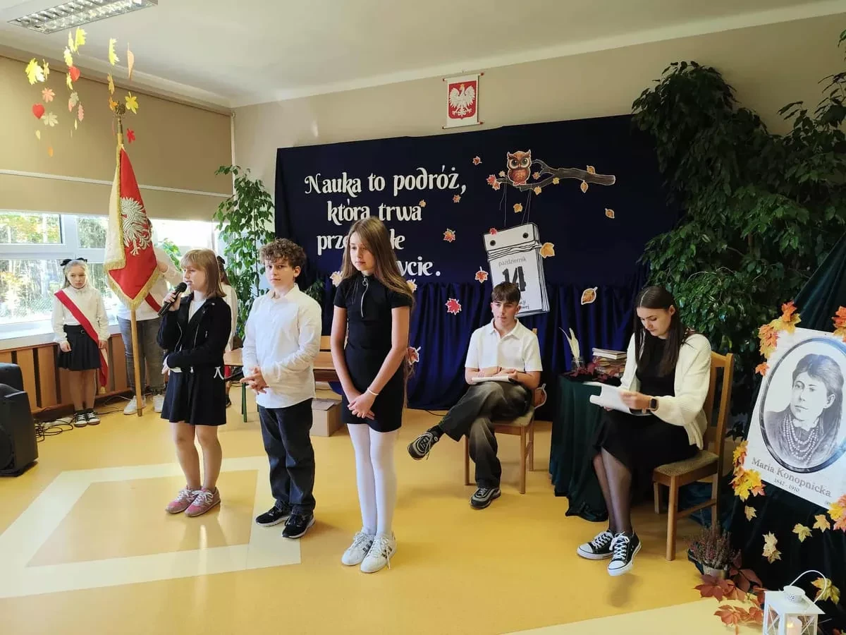 W uroczystości uczestniczyli uczniowie, nauczyciele, pracownicy szkoły oraz zaproszeni goście, którzy z radością przyjęli zaproszenie i wspólnie świętowali ten wyjątkowy dzień. Część artystyczną przygotowali uczniowie klas V-VIII, prezentując swoje talenty aktorskiei recytatorskie. Ich występ był pięknym wyrazem szacunku, wdzięczności i pamięci o Patronie Szkoły - Marii Konopnickiej oraz wszystkich, którzy codziennie tworzą szkolną społeczność.
