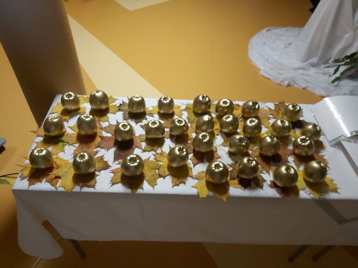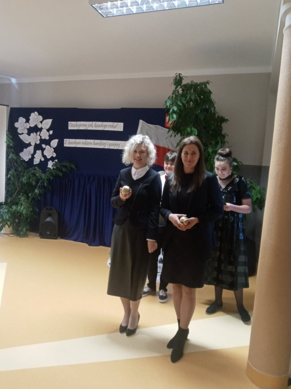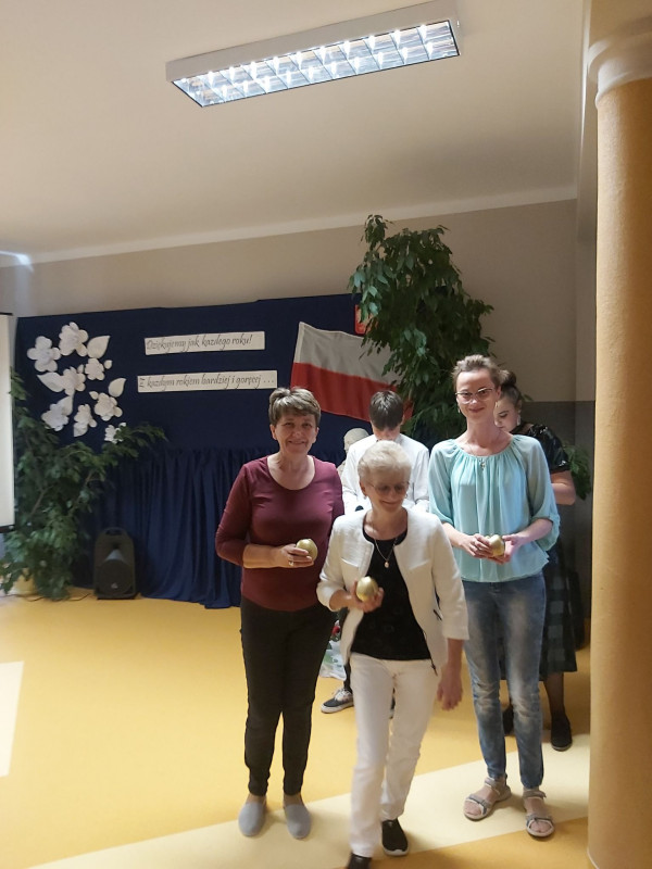 W kolejnej części było bardzo wesoło!! Uczniowie klasy III przygotowali krótką część artystyczną w której wierszami i piosenkami dziękowali nauczycielom za ich pracę i trud. Zebrani obejrzeli również humorystyczną scenkę, w której przedstawiony został proces powstawania wzorowego ucznia oraz odbyła się uroczysta Gala Oskarowo - Jabłkowa.