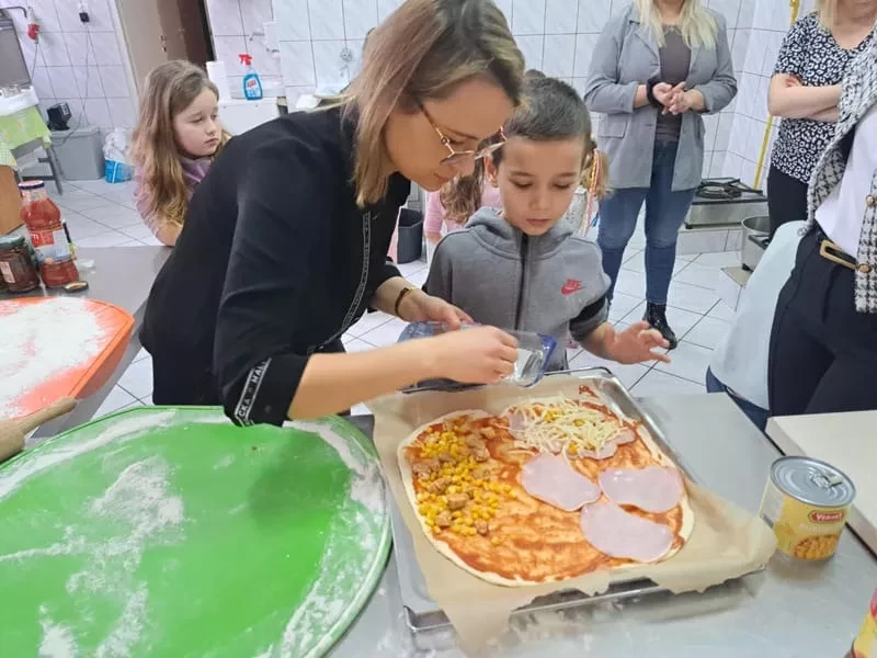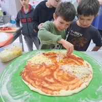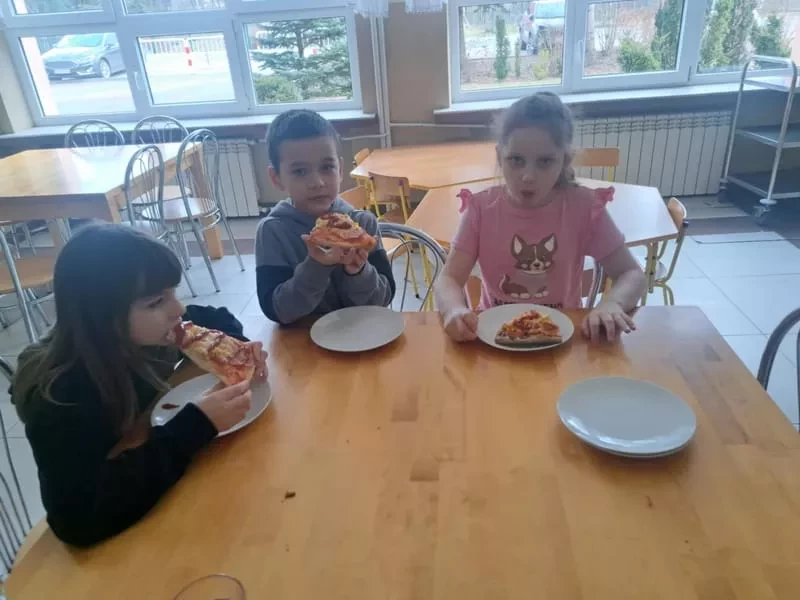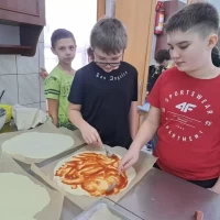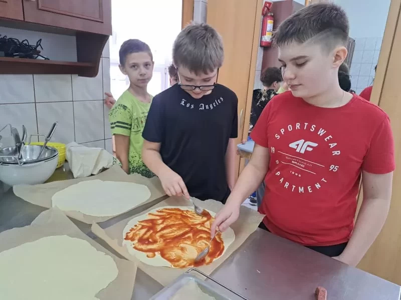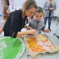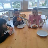 Wielką frajdę sprawiły przygotowania: smarowanie ciasta, dekorowanie pizzy przyniesionymi składnikami. Gdy już wszystko było gotowe pizza powędrowała do piekarnika aby się upiec. Następnie uczniowie z wielkim apetytem próbowali własnoręcznie przygotowanej pizzy. Cały dzień upłynął nam w miłej i radosnej atmosferze. Dzięki tej imprezie dzieci poznały historię pizzy, dowiedziały się z którego kraju pochodzi oraz wspólnie stwierdziliśmy, że własnoręcznie zrobiona pizza jest o wiele zdrowsza i smaczniejsza.