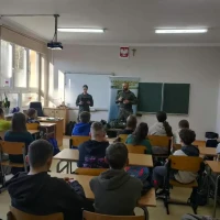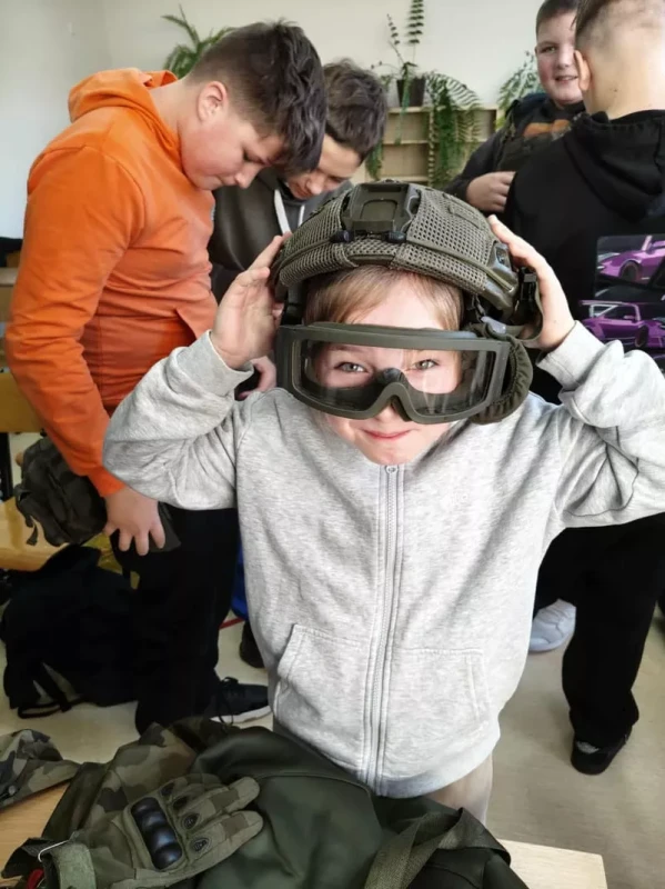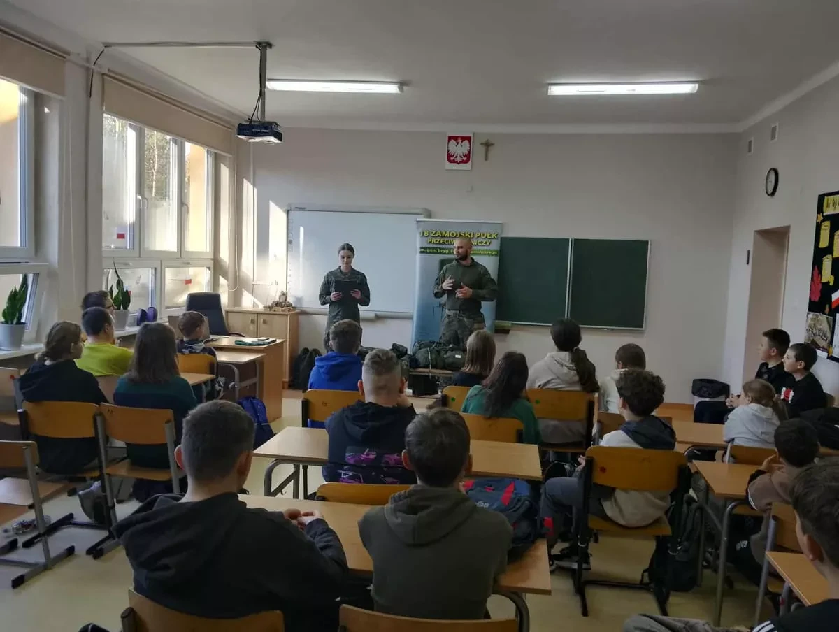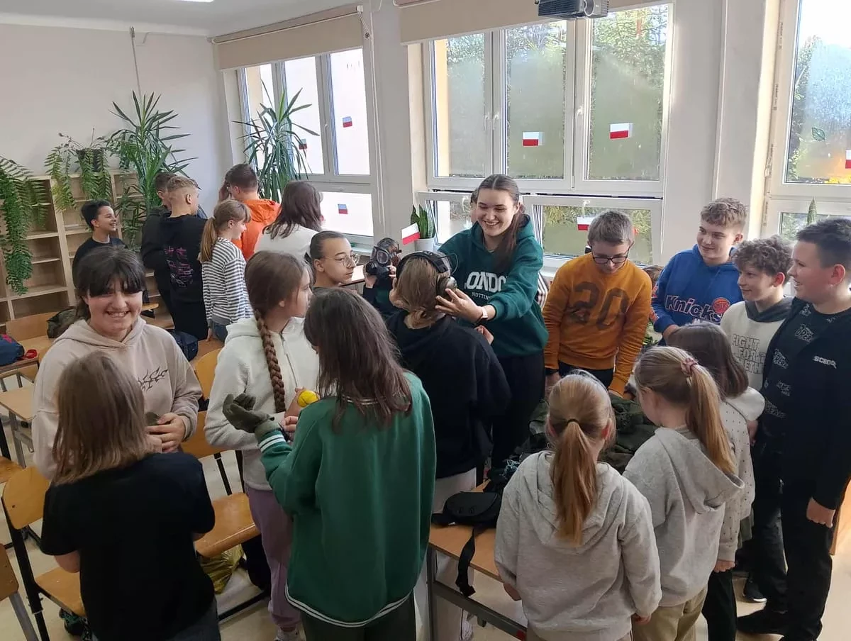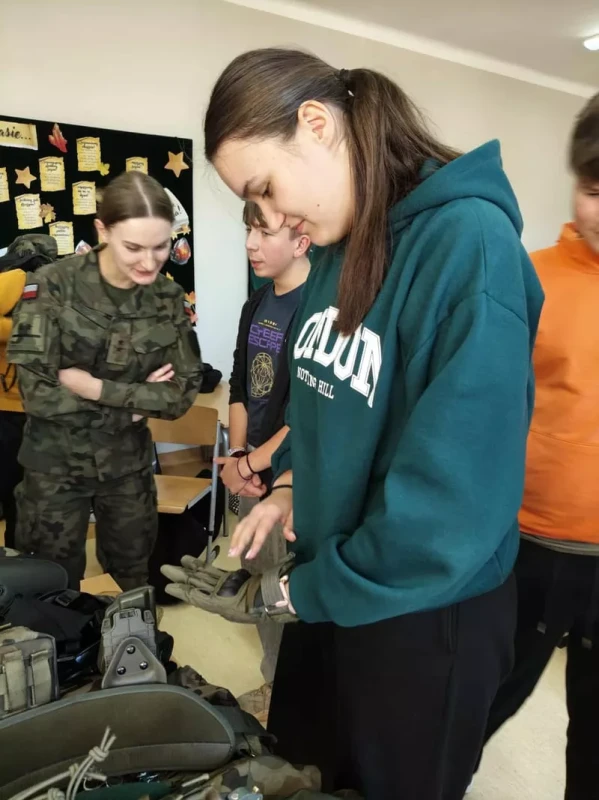 Żołnierze w ciekawy sposób zaprezentowali elementy musztry, pokazali wyposażenie wojskowe oraz omówili codzienną służbę w wojsku. Uczniowie mieli również okazję zadawać pytania, przymierzyć umundurowanie i sprzęt oraz dowiedzieć się, jak można w przyszłości rozpocząć karierę wojskową. Spotkanie przebiegało w przyjaznej i interesującej atmosferze, a uczniowie z dużym zaangażowaniem uczestniczyli w zajęciach praktycznych. Zajęcia stanowiły cenne doświadczenie, które pozwoliło młodzieży lepiej zrozumieć rolę Wojska Polskiego oraz znaczenie obronności i bezpieczeństwa narodowego.