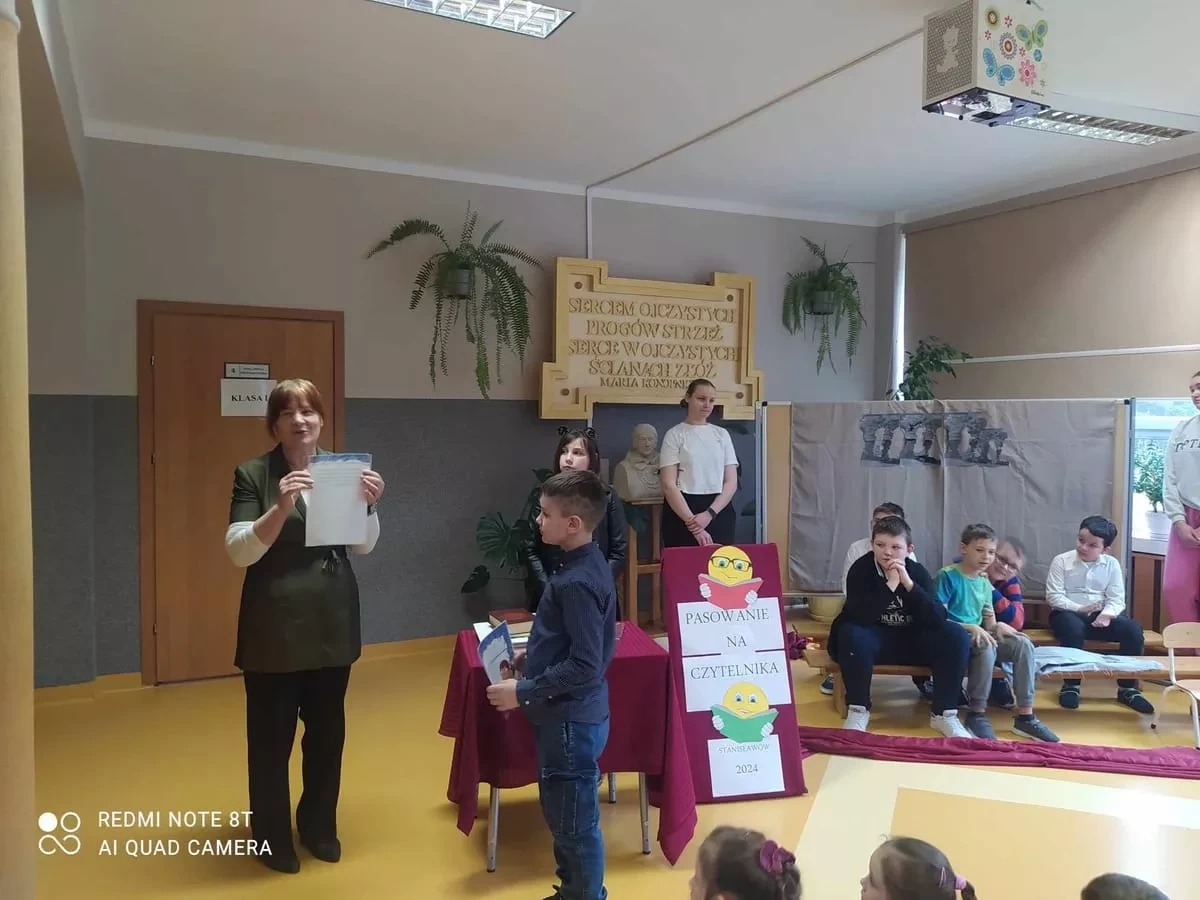 Wszyscy otrzymali książki i zakładki oraz okolicznościowy dyplom. Całe wydarzenie przebiegało w bardzo miłej i serdecznej atmosferze. Występujący znakomicie wywiązali się ze swojego zadania, dzieci siedzące na widowni zachowywały się wzorowo, a klasę IV dodatkową pomocą wsparli nauczyciele, pracownicy szkoły i uczennice z klasy VII.