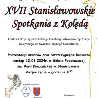 Przegląd Kolęd i Pastorałek XVII Stanisławowskich Spotkań z Kolędą w dniu 12.01.2024 r. w Szkole Podstawowej im. Marii Konopnickiej w Stanisławowie ma charakter zamknięty i odbędzie się wyłącznie dla uczniów szkoły, uczestników przeglądu oraz zaproszonych gości.