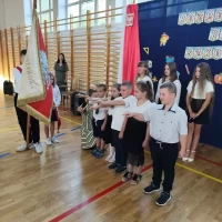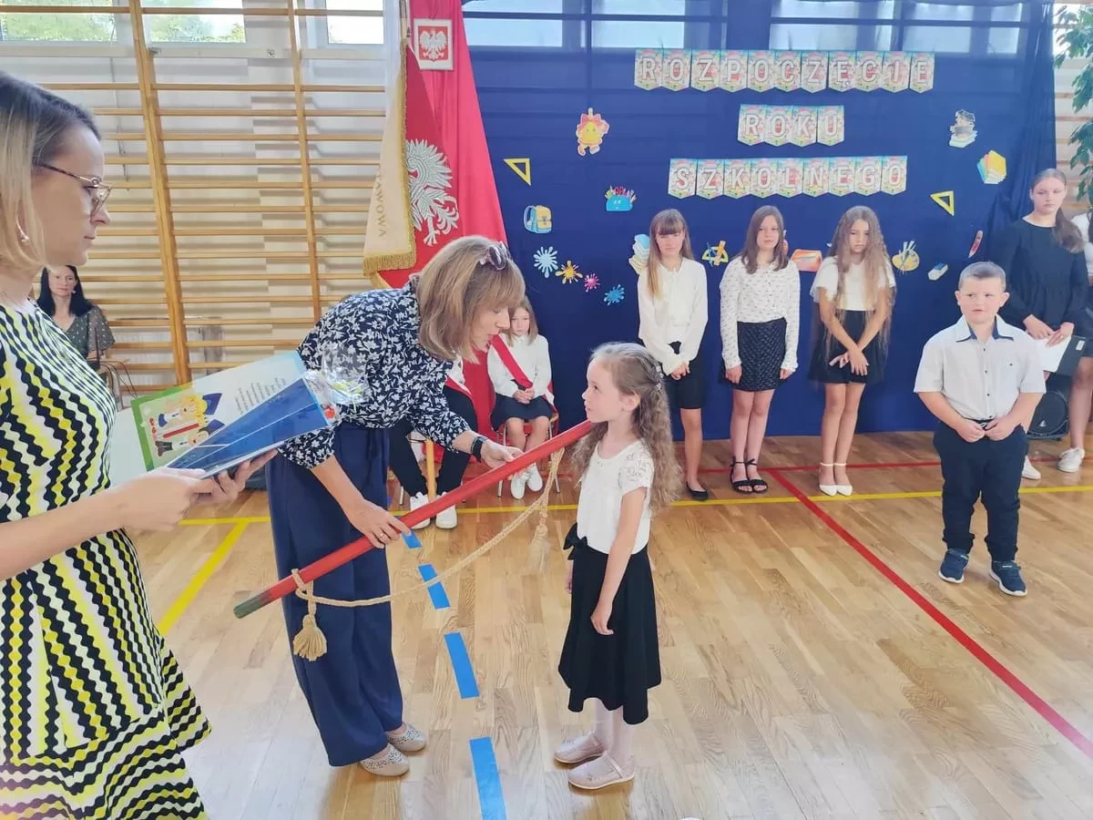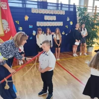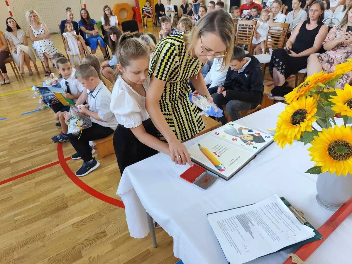 W niezwykle podniosłej atmosferze, przed biało - czerwoną flagą pierwszoklasiści ślubowali być dobrymi Polakami, godnie reprezentować swoją szkołę, swym zachowaniem i nauką sprawiać radość rodzicom i nauczycielom. Po złożeniu ślubowania Pani Dyrektor Katarzyna Traczyk- Surmacz dokonała symbolicznego pasowania na ucznia.