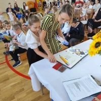 Pani dyrektor życzyła pierwszoklasistom sukcesów w nauce oraz zapewniła o pomocy i opiece starszych kolegów w szkole i poza nią. Do życzeń dołączyła się również Rada Rodziców, przewodnicząca, Pani Bożena Kudełka wręczyła pierwszakom piękne upominki. Ten dzień na długo zostanie uczniom w pamięci.