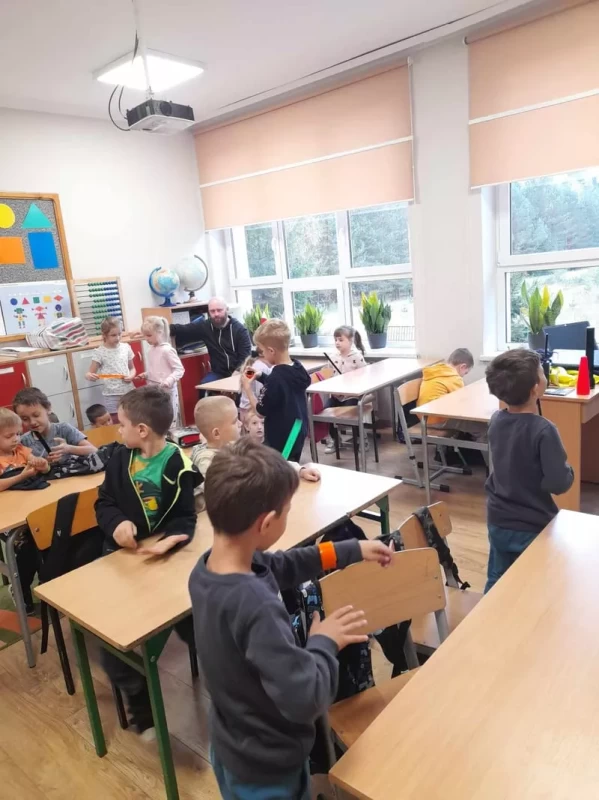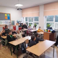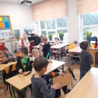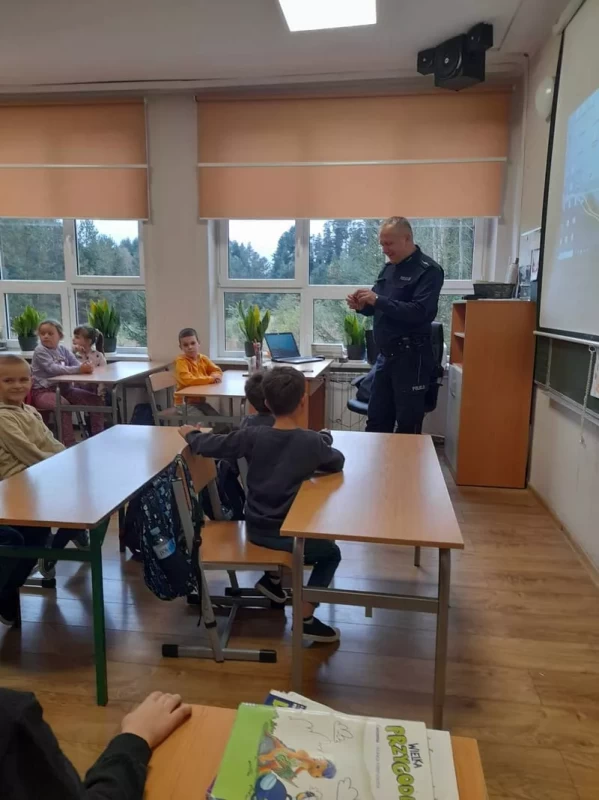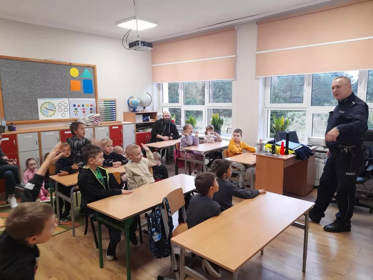 Dnia 16.10.2023r. uczniowie z naszej szkoły mieli okazję spotkać się z Panem Markiem Lisem dzielnicowym z Komisariatu Policji w Józefowie. Podczas spotkania wszyscy przypomnieli sobie zasady bezpiecznego poruszania się po drogach oraz jak reagować w różnych sytuacjach zagrożeń. Policjant ostrzegał też przed osobami nieznajomymi, z którymi nie wolno rozmawiać oraz wpuszczać do domu. Przypomniał o podstawowych zasadach bezpieczeństwa w ruchu drogowym, podkreślił ważną rolę elementów odblaskowych, które każdy uczeń powinien posiadać. Dzieci wysłuchały policyjnych rad oraz zadawały wiele interesujących pytań. Szczególnym zainteresowaniem wśród uczniów cieszyła się prezentacja wyposażenia policyjnego, niezbędnego podczas wykonywania pracy.