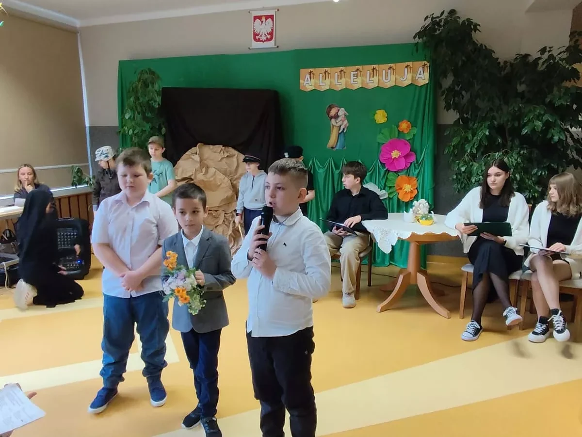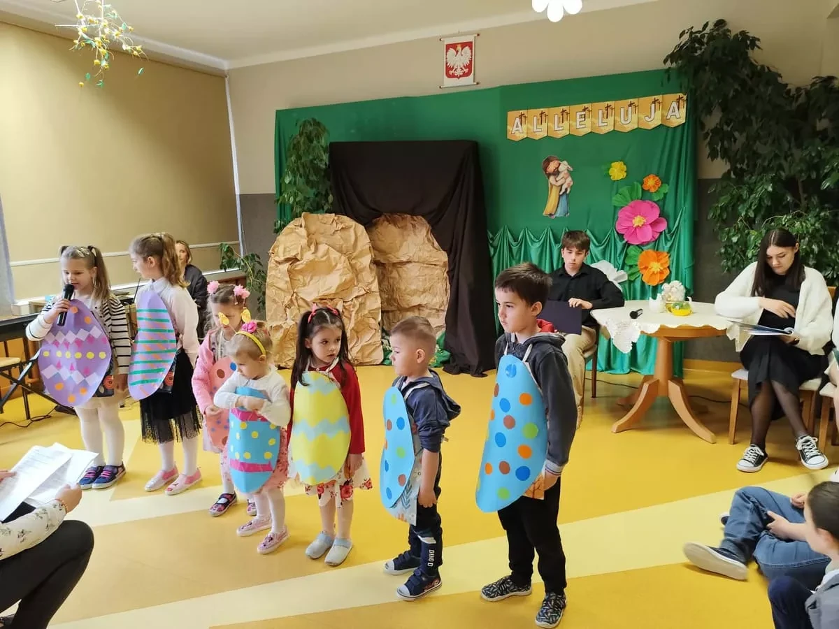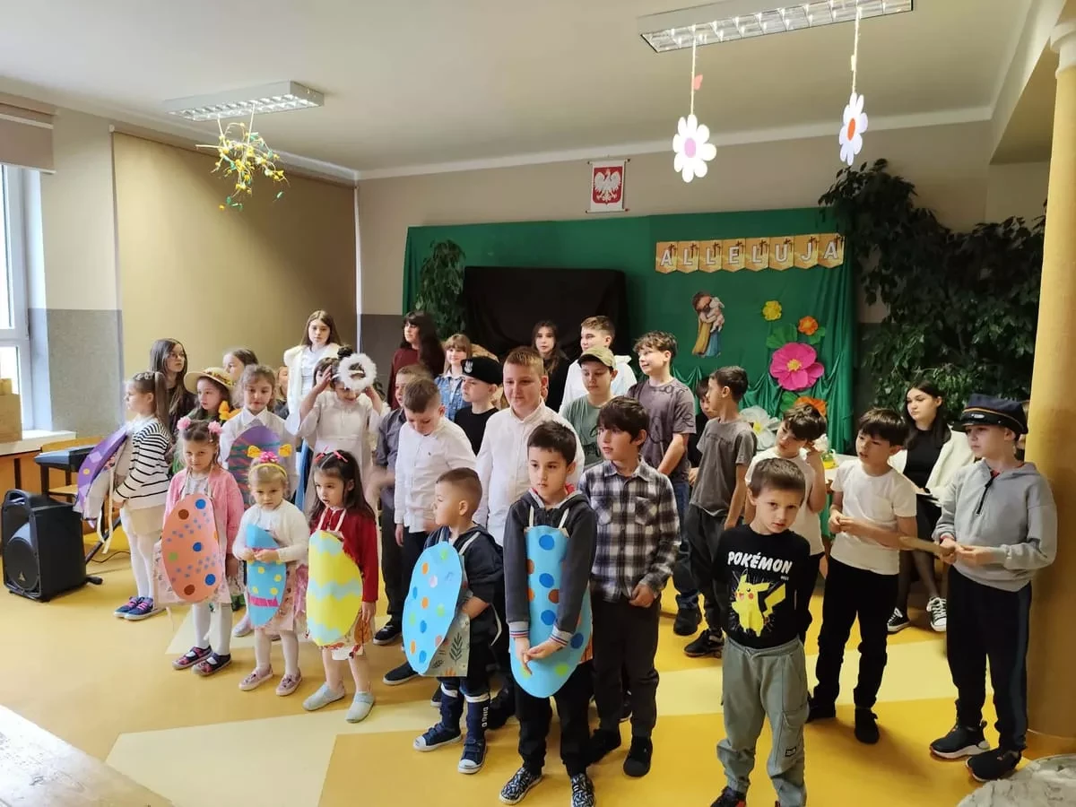 W dniu 1 kwietnia 2026 roku w naszej szkole odbył się uroczysty apel z okazji Świąt Wielkanocnych. Wydarzenie miało charakter zarówno religijny, jak i świecki - uczniowie zaprezentowali program artystyczny nawiązujący do tradycji i symboliki świąt, a także zwyczajów związanych z pisankami i wielkanocnymi obrzędami.
