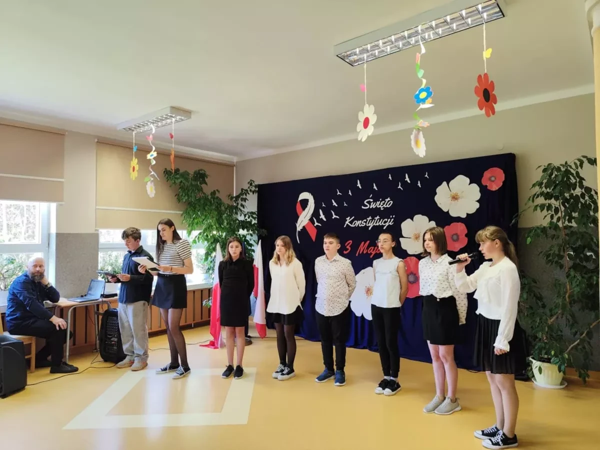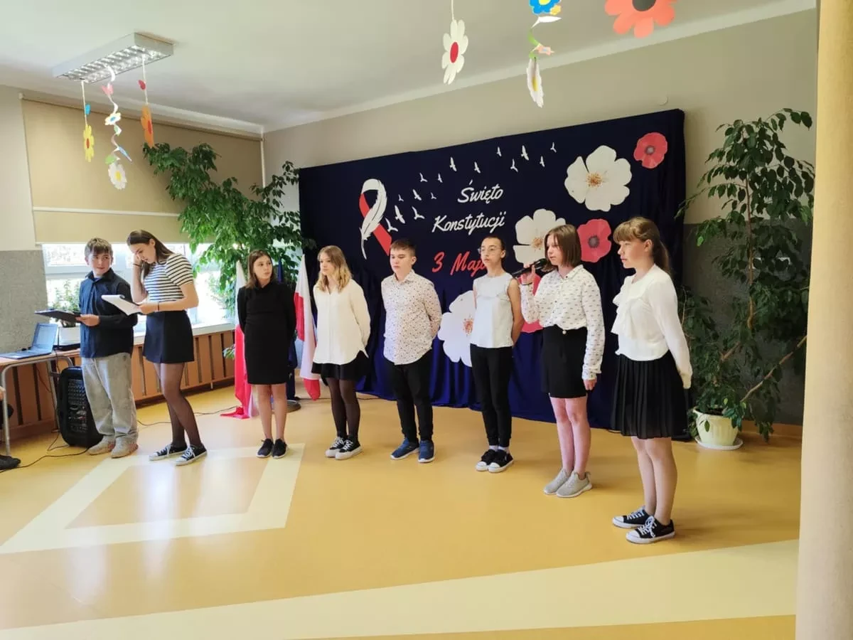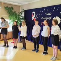 W środę 30 kwietnia 2025 r. w naszej szkole odbyła się uroczysta akademia z okazji rocznicy uchwalenia Konstytucji 3 Maja. Uczniowie pod kierunkiem pani Ewy Knap, pani Agnieszki Blicharz oraz pana Rafała Knapa przygotowali montaż słowno - muzyczny, który przybliżył wszystkim zebranym to ważne wydarzenie z historii naszej Ojczyzny.