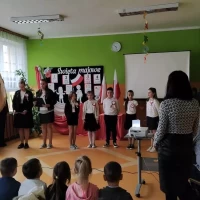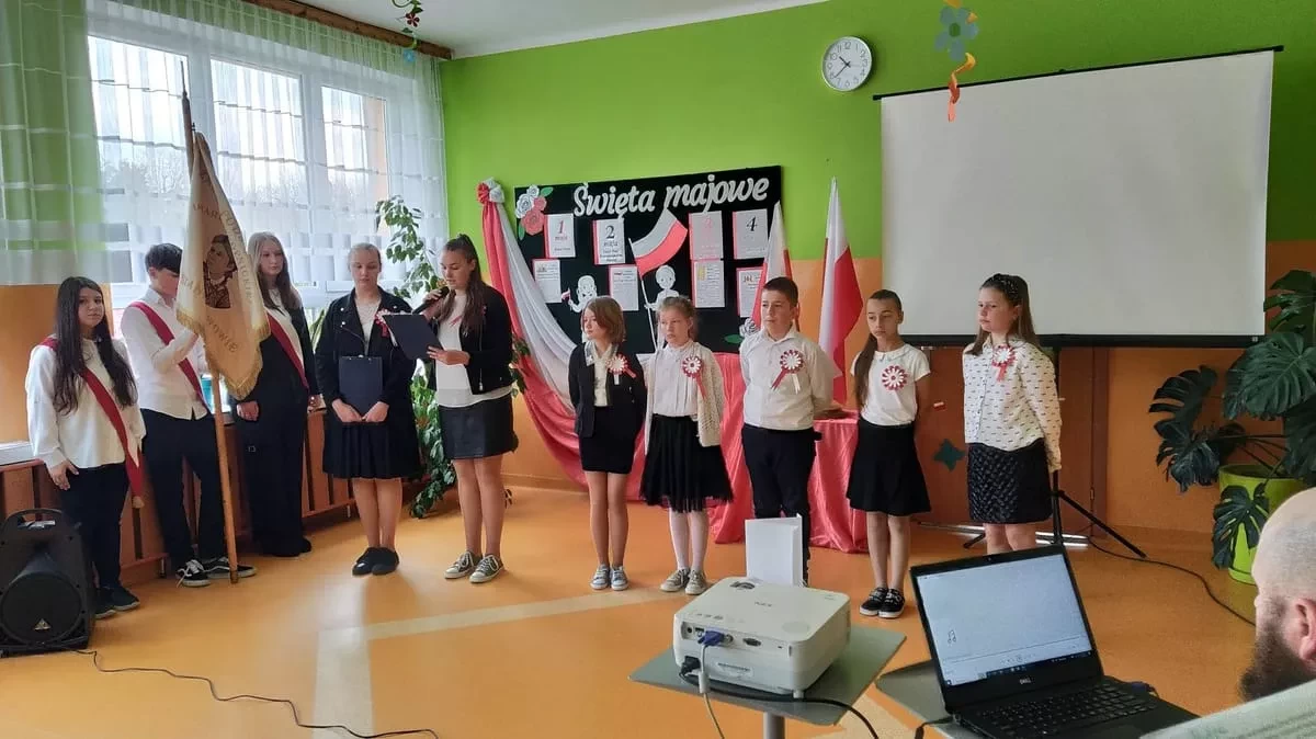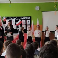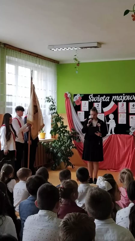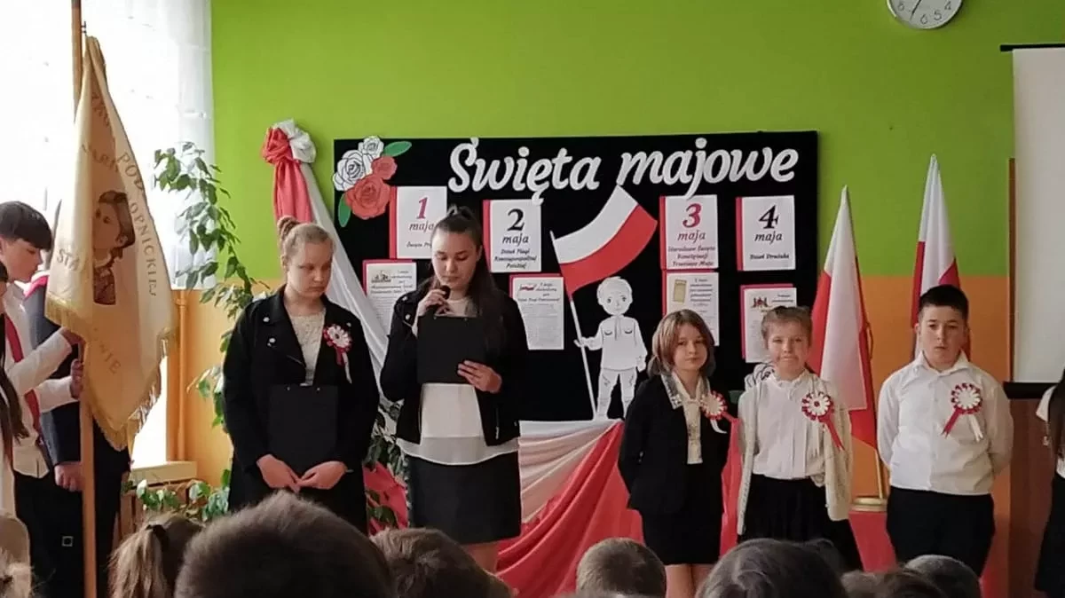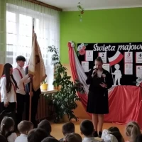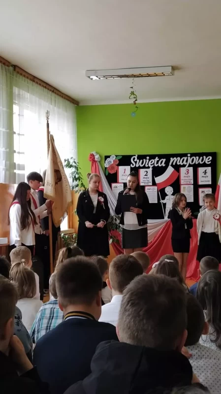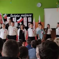 W piątek 28 kwietnia 2023r. w naszej szkole odbyła się uroczysta akademia z okazji rocznicy uchwalenia Konstytucji 3 Maja. Uczniowie pod kierunkiem pani Ewy Knap oraz pana Rafała Knapa przygotowali montaż słowno – muzyczny, który przybliżył wszystkim zebranym to ważne wydarzenie z historii naszej Ojczyzny. Poprzez dekorację oraz zapadające w pamięć teksty poetyckie występujący zaakcentowali rangę uchwalenia konstytucji, która odegrała kluczową rolę w procesie kształtowania nowoczesnego państwa i szerzenia postaw obywatelskich. Doniosły charakter tego spotkania podkreśliły także odświętne stroje uczestników oraz biało – czerwone kotyliony.