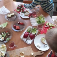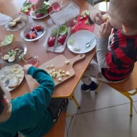 Dlatego też dzieci chętnie przystąpiły do przygotowania zdrowego śniadania. Przedszkolaki wykorzystując swoje ulubione produkty takie jak: wędlinę, ser, pomidorki, ogórki, sałatę przygotowały wesołe kanapki. Na talerzykach można było dostrzec kanapkowe motylki, kwiatuszki, kotki, myszki a także wiele innych. Przedszkolaki zajadały się własnoręcznie przygotowanymi kanapkami.