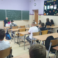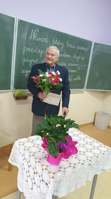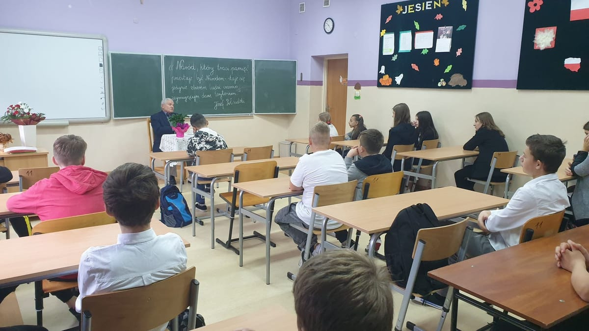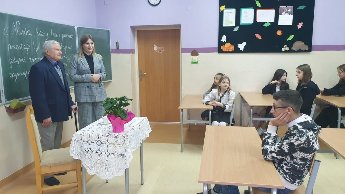 W tym roku przypada dokładnie 80 rocznica wysiedleń ludności polskiej z terenów Zamojszczyzny, w czasie której szczególnie dramatyczny był los dzieci. W związku z tą rocznicą, 10 listopada naszą szkołę odwiedził pan Franciszek Momot, który w tamtym czasie jako kilkuletnie dziecko razem ze swoją rodziną trafił do obozu na Majdanku w Lublinie. Gość opowiedział uczniom klas V-VIII i nauczycielom o swoich osobistych przeżyciach i wydarzeniach związanych działaniami wojennymi w czasie II wojny światowej. Opowiadanie spotkało się z dużym zainteresowaniem młodzieży, która pod koniec zadawała gościowi pytania.